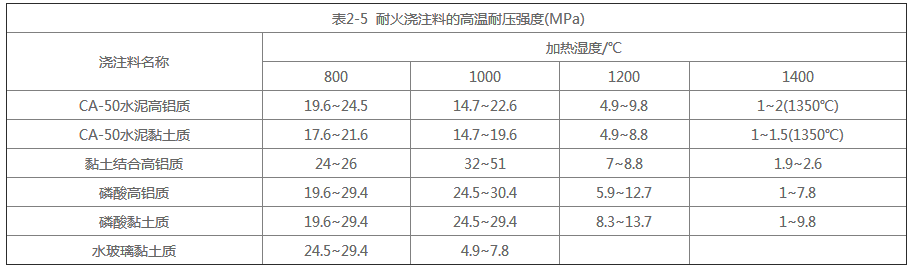 在加熱溫度為800℃以下時(shí),不定形耐火材料試樣處于彈性變形階段,其高溫耐壓強(qiáng)度一般與燒后耐壓強(qiáng)度相似或略低些;當(dāng)高于800℃時(shí),其試樣處于塑性變形階段,所以高溫耐壓強(qiáng)度隨著加熱溫度的升高而逐步降低,到1400℃時(shí), 只有1~10MPa。表2-5為耐火澆注料的高溫耐壓強(qiáng)度,從表中看出,黏土結(jié)合耐火澆注料的高溫耐壓強(qiáng)度優(yōu)于其他幾種材料,而且中溫強(qiáng)度較好。