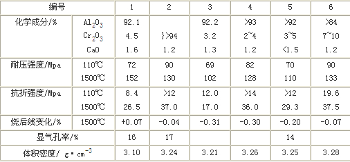 下表為鉻剛玉質耐火澆注料的性能。表中編號1用板狀剛玉作耐火骨料,電熔白剛玉作粉料。編號2用致密剛玉作耐火骨料和粉料。其余的用電熔白剛玉作耐火骨料和粉料。耐火骨料臨界粒徑為10mm或8mm,總用量為70%;同時還采用a-Al2O3超微粉、工業氧化鉻和很 少量的mf- SiO2作耐火粉料。編號5用CA-80水泥作結合劑,其余的結合劑為CA-70水泥。同時摻加減水劑和緩凝劑等。從表中看出,Al2O3和Cr2O3合量大于94%料的純度很高。體積密度大于3.10 g·cm-3,料較致密。110℃烘干和1500℃燒后耐壓強度分別大于68Mpa和102Mpa,1500℃燒后線變化除編號1外均呈負值,即略有收縮。總之,高純度鉻剛玉質耐火澆注料的性能是優良的。