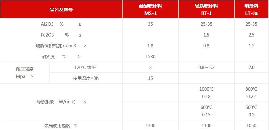 噴涂料分類按材料體積密度分有輕質噴涂料、中重質噴涂料和重質噴徐料。輕質噴涂料用作保溫和隔熱襯,中重質噴徐料既可作隔熱襯里,而重質噴涂料主要作工作襯里。